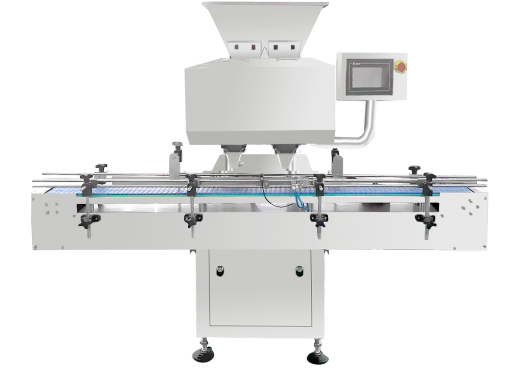 Конфеты равномерно распределяются по каналам, где фотоэлектрические датчики подсчитывают продукт с высокой точностью и затем дозируют в бутылки в заданном количестве.