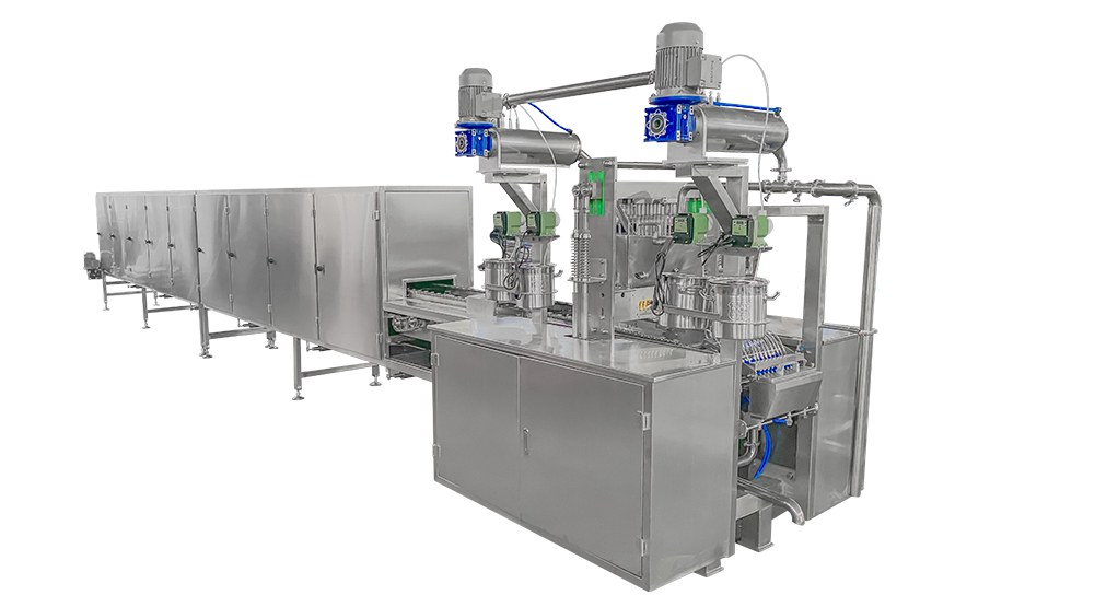 Автоматизированная линия предназначена для производства желейных конфет методом отливки в разрушаемые крахмальные формы. Оборудование оснащено ПЛК-управлением, а максимальная производительность линии составляет от 400 до 800 кг/час.