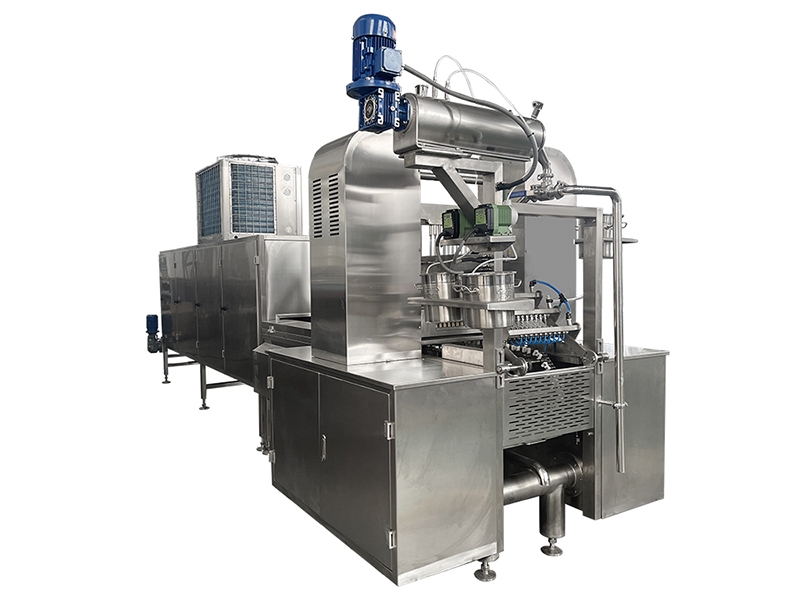 Двухходовой охлаждающий туннель расположен сразу после отсадочной машины. Охлаждение конфет происходит следующим образом: воздух забирается из окружающей среды для циркуляции через туннель с помощью нескольких вентиляторов, тем самым продувая и охлаждая только что изготовленные изделия. После этого операторам необходимо положить конфеты в холодильник. Фактически по выходу из блока охлаждения, конфеты имеют готовый вид, и им требуется лишь полежать в холодильной камере определённое время.