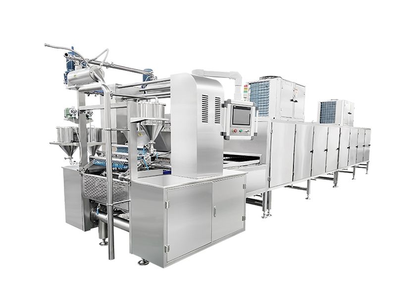 Двухходовой охлаждающий туннель расположен сразу после отсадочной машины. Охлаждение конфет происходит следующим образом: воздух забирается из окружающей среды для циркуляции через туннель с помощью нескольких вентиляторов, тем самым продувая и охлаждая только что изготовленные изделия. После этого операторам необходимо положить конфеты в холодильник. Фактически по выходу из блока охлаждения, конфеты имеют готовый вид, и им требуется лишь полежать в холодильной камере определённое время.