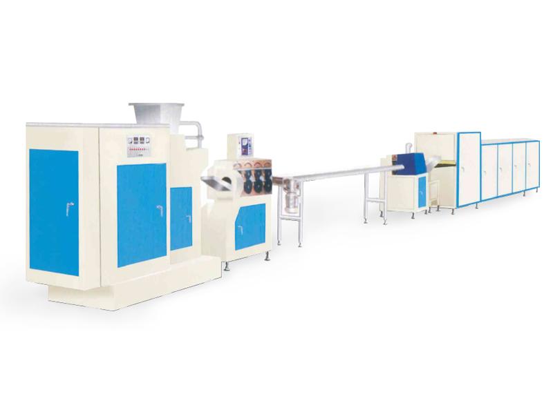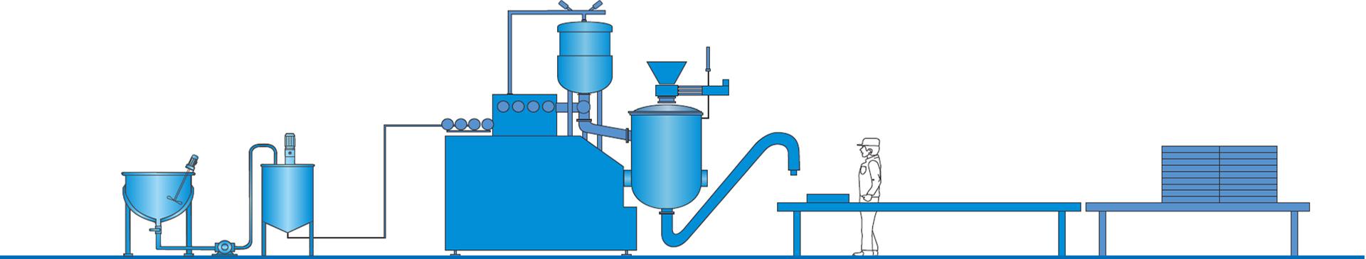 Линия производства конфет Тоффи методом штамповки состоит из аппарата варки конфет Тоффи, аппарата для приготовления карамели, тянульной машины, насоса для варенья, экструдера для производства конфет, формовочной машины цепного типа, распределительного конвейера, охлаждающего шкафа.