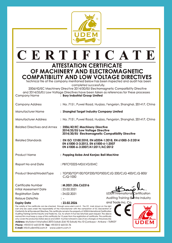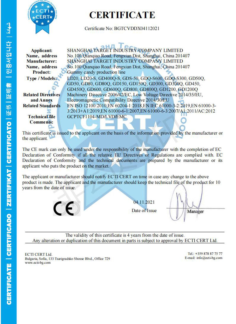 В 2015 году, наша компания успешно прошла сертификацию ISO9001, а также обладает знаком соответствия и качества CE. Мы начали экспортировать кондитерское оборудование в 2000 году, сейчас, наша продукция рассылается во многие страны и регионы, включая Америку, Бразилию, Британию, Россию Индию и Таиланд. Более того, продукция от компании TG Machine, уже удостоилась многочисленных положительных отзывов, благодаря превосходному качеству и высокой эффективности. Мы никогда не останавливаемся на достигнутом и всегда стремимся вывести производимую нами продукцию на новый уровень.